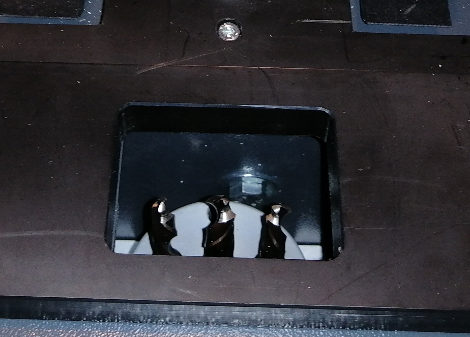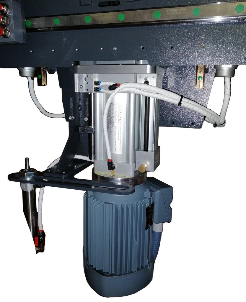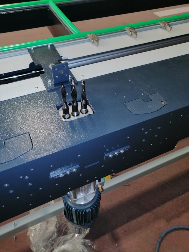 Modulo para realizar el mecanizado para la manilla en la hoja. El taladro realiza los tres orificios al mismo tiempo. Cuenta con motor de gran potencia, avance oleo-neumático, regulación de profundidad tanto vertical como horizontal.