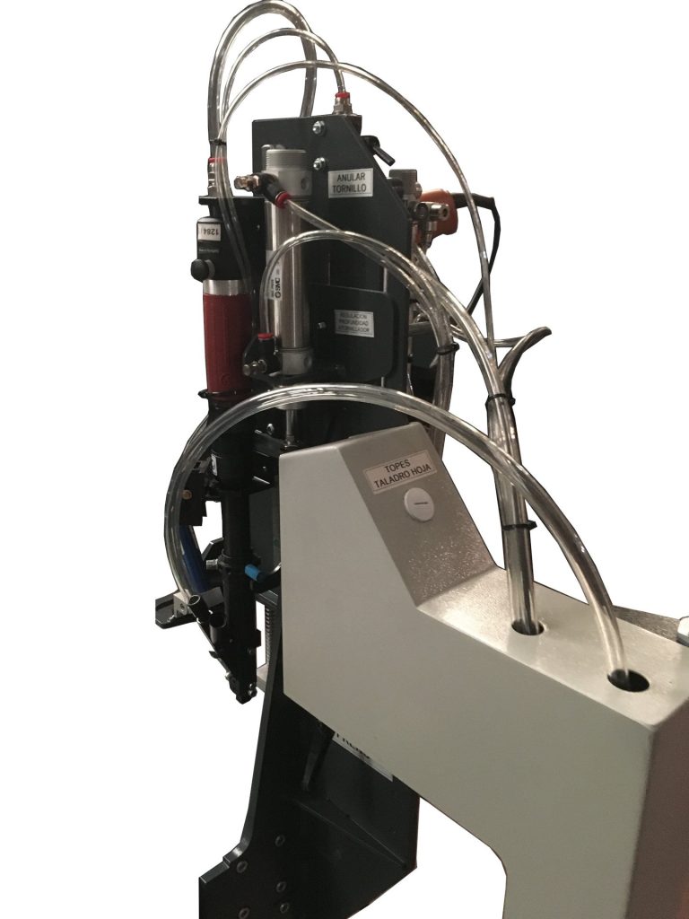 Modulo para realizar el mecanizado y atornillado de las bisagras en el marco. El taladro realiza los seis orificios al mismo tiempo. Cuenta con motor de gran potencia, avance oleo-neumático, regulación de profundidad, aproximación rápida, topes para el posicionamiento de los orificios. El atornillador cuenta con alimentación automática de tornillos, altura ajustable, embrague limitador par de apriete fácilmente regulable. Se puede añadir un láser para facilitar el alineado con los orificios del herraje.