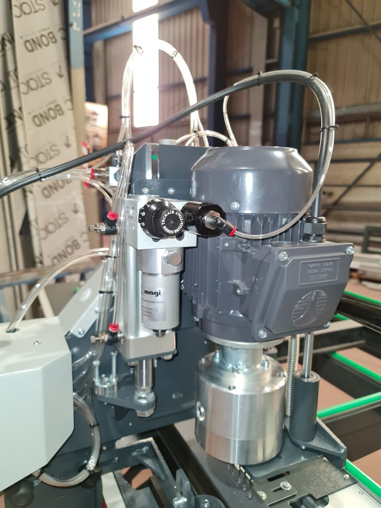 Modulo para atornillar los herrajes en la hoja, cuenta con alimentación automática de tornillos, altura ajustable, embrague limitador par de apriete fácilmente regulable. Se puede añadir un láser para facilitar el alineado con los orificios del herraje.
