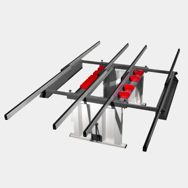 Banco de trabajo fijo de cuatro brazos extensibles diseñado para poder realizar montaje de carpinterías.