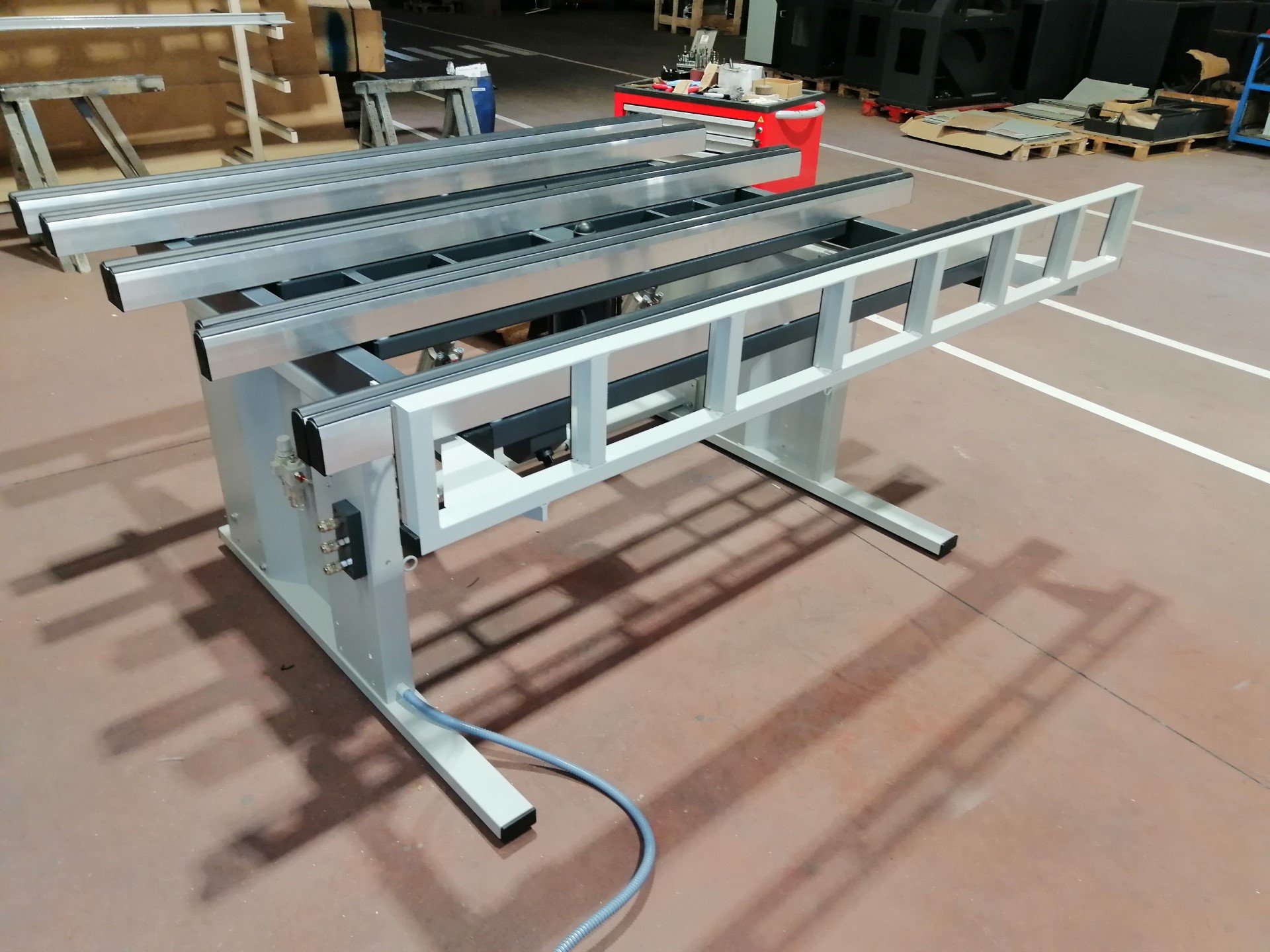 Banco de trabajo basculante y giratorio de cuatro brazos extensibles diseñado para poder realizar montaje de carpinterías.