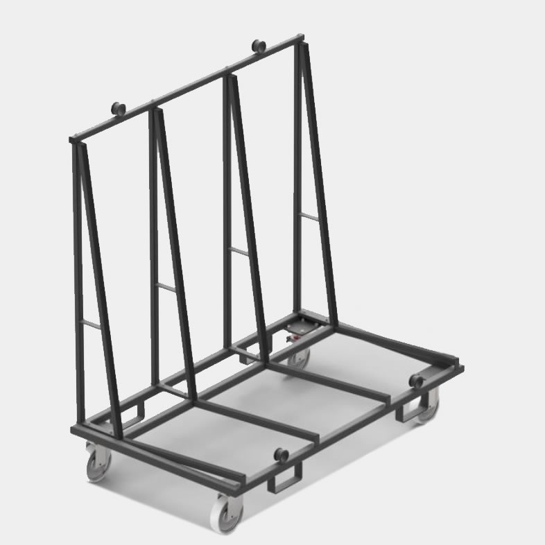 El CA-V2 ofrece las mismas funcionalidades del CA-V estándar —superficie de goma, puntos de anclaje para asegurar la carga y topes para carretilla elevadora— en unas dimensiones de base más reducidas (700×1.520 mm frente a 865×2.440 mm del CA-V), lo que lo hace adecuado para talleres con pasillos estrechos o espacios de almacenaje limitados.