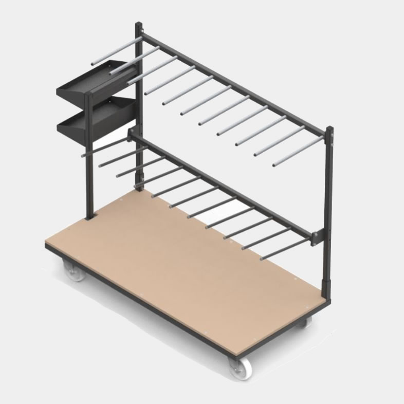 Carro porta ventanas con dos cajones para herrajes integrados para transportar ventanas terminadas con su herraje asociado en un único desplazamiento.