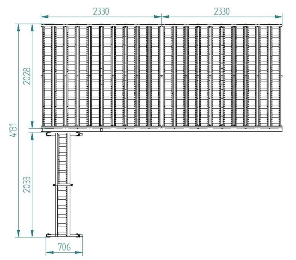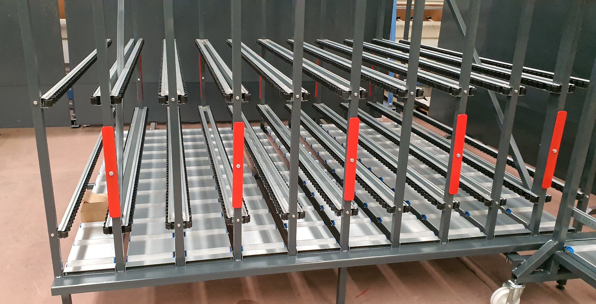 Está compuesto por módulos de almacenaje que se pueden unir en línea en la cantidad necesaria. Cada modulo dispone de 10 huecos de 129 mm.de ancho por 2900 mm. de altura Y 2000 mm de fondo. Las ventanas se deslizan mediante rodillos por su parte inferior y mini carriles de rodillos por sus laterales. Se puede acceder desde ambos lados.