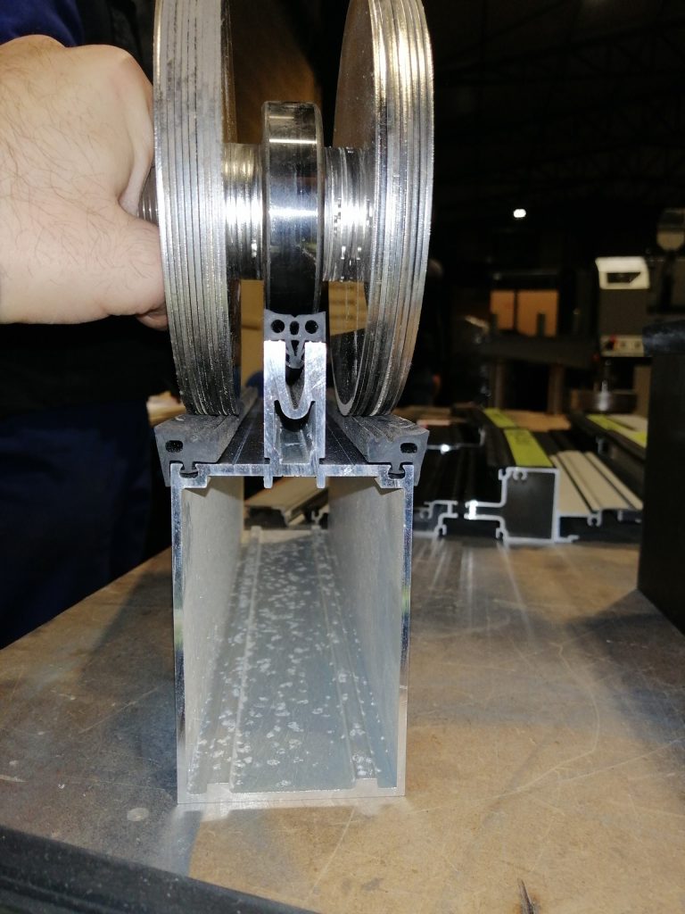 Máquina desarrollada para ensamblar las gomas en las carpinterías de aluminio, con un sistema de avance semiautomático del perfil y una gran capacidad de alimentación que la convierten en la solución idónea para ensamblado de gomas incluso en los grandes perfiles estructurales del muro cortina.